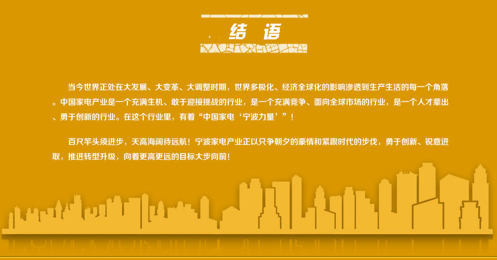 寧波家電產(chǎn)業(yè)在集群化成長、發(fā)展和壯大進程中,呈現(xiàn)出六個方面的特點與優(yōu)勢:寧波家電產(chǎn)業(yè)民營化的經(jīng)營主體格局,其活力指數(shù)一直領跑全國;專業(yè)化的產(chǎn)業(yè)協(xié)同分工,使得量大面廣的中小企業(yè)形成了從零部件生產(chǎn)到整機制造的配套協(xié)作生態(tài)體系;完備化的家電產(chǎn)品門類,空調(diào)、冰箱、洗衣機等20多個細分行業(yè)、上萬個品種;集群化的產(chǎn)業(yè)生態(tài)體系,形成了以鄞州區(qū)、國家高新區(qū)為中心的城市家電產(chǎn)業(yè)帶,以慈溪、余姚和寧波杭州灣新區(qū)為中心的家電產(chǎn)業(yè)集聚區(qū);國際化的對外貿(mào)易優(yōu)勢,出口與內(nèi)銷并舉,家電產(chǎn)品出口交貨值占了全市出口總量的近一成;蓬勃涌現(xiàn)的企業(yè)家群體,在寧波家電產(chǎn)業(yè)領域中,涌現(xiàn)了一大批新寧波商幫的代表人物。