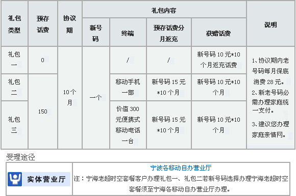 2010年5月6日起:您預(yù)存0/150元,即可獲得超值的移動(dòng)親情禮包一個(gè),每個(gè)手機(jī)號(hào)碼限辦理一次。具體如下: