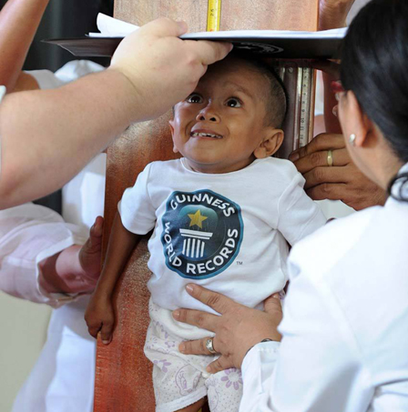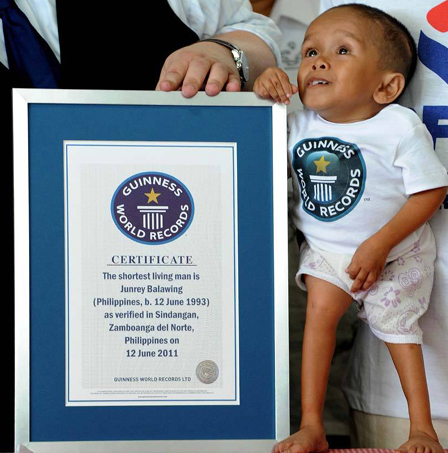 6月12日,在菲律賓北三寶顏省辛當(dāng)岸,工作人員正在為18歲的菲律賓人瓊?cè)稹ぐ屠瓬仡C發(fā)證書。當(dāng)日,身高59.93厘米的巴拉溫在他的生日當(dāng)天獲得吉尼斯世界紀(jì)錄正式認(rèn)證,成為全球最矮成年男子。此前,這一紀(jì)錄是由尼泊爾男青年卡根德拉·塔巴·馬加爾保持的,他的身高為67厘米。