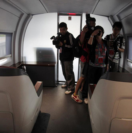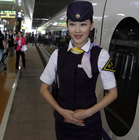 6月16日,多家媒體的記者今日獲邀體驗(yàn)京滬高鐵G2次試驗(yàn)列車。從2008年4月開始動(dòng)工,歷經(jīng)三年多的京滬高鐵即將正式投入運(yùn)營,京滬高鐵列車成為眾多媒體關(guān)注的焦點(diǎn)。圖為京滬高鐵列車高素質(zhì)的乘務(wù)員媲美“空姐”。