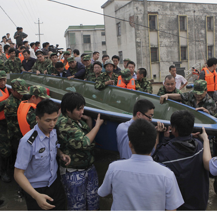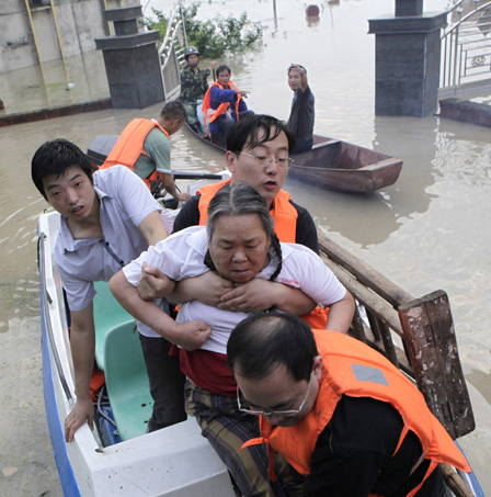 6月16日,救援隊員在浙江省諸暨市浦陽江湄池段轉(zhuǎn)移群眾。受連日暴雨影響,浙江諸暨市4個低標(biāo)準(zhǔn)湖畈進水,被淹約3103戶,受災(zāi)人口9269人。