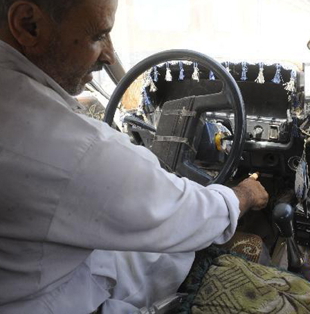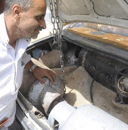 6月25日,在也門首都薩那,一名出租車司機(jī)展示其汽車的“動(dòng)力裝置”。薩那自3月起燃料短缺,目前由于無(wú)法買到汽油,許多出租車司機(jī)為了營(yíng)生,開始使用烹飪用液化氣為汽車提供燃料動(dòng)力。