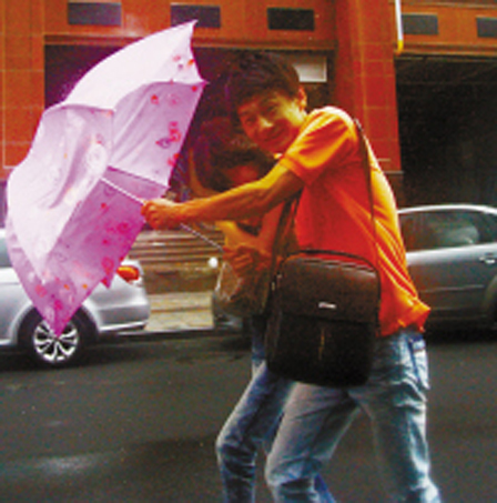 受“米雷”影響,昨日市區(qū)雨量明顯,并且伴隨強(qiáng)風(fēng)。圖為車轎街上行人撐傘艱難行走。寧波晚報(bào)記者許天長(zhǎng)