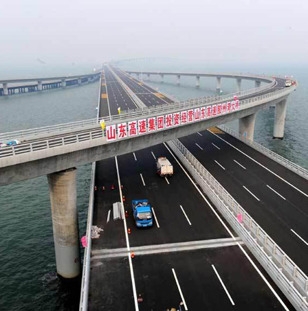 6月27日,工程車輛在膠州灣大橋紅島互通立交上行駛。當日,山東高速膠州灣大橋通過了相關(guān)部門的交工驗收。山東高速膠州灣大橋全長36.48公里,是目前世界上已建成的最長的跨海大橋,是國道主干線——青蘭高速的起點段。新華社記者李紫恒攝