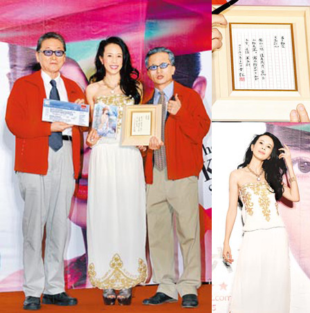 莫文蔚29日赴臺為七夕情人節(jié)個唱宣傳,李敖(左起)破例為歌手站臺,以“人類最后一代文人寫的毛筆字”寫下“君子豹變,其文蔚也”,解釋“文蔚”二字原自易經(jīng)64卦,“像豹一樣,隨著歲月,變化自己的美麗”。