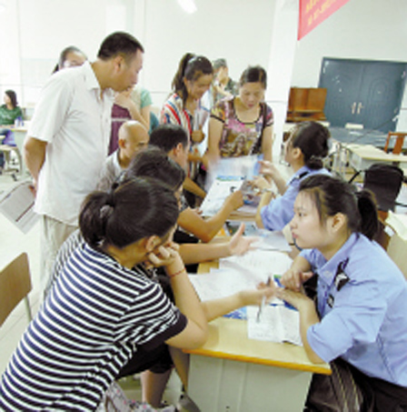 一名鎮(zhèn)海籍考生今年只考了377分,從鎮(zhèn)海趕來洽談會報名時,人顯得很沮喪!皫讉志愿都沒錄取,現(xiàn)在不奢求什么好專業(yè)、好學(xué)校,能有書讀就不錯了。”秦皇島東方航空服務(wù)專業(yè)學(xué)校是民辦學(xué)校,雖然學(xué)費不低,但是前來咨詢的考生卻不少。該校招生老師介紹,學(xué)生畢業(yè)后可直接分配到有關(guān)機(jī)場工作。對此,中招辦相關(guān)人員表示,有些優(yōu)秀學(xué)生分配是可能的,但說全部包分配這話不可全信。
