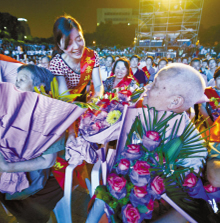 昨晚,“黨旗更鮮艷”海曙區(qū)慶祝建黨90周年大型廣場(chǎng)文藝晚會(huì)在中山廣場(chǎng)舉行。晚會(huì)中,9位特殊的老人在志愿者攙扶下與大家見面,他們都是立下赫赫戰(zhàn)功的老紅軍、老革命、老戰(zhàn)士,他們是這個(gè)國(guó)家的功臣,是黨的功臣,是人民的功臣!他們的事跡深深地感染著全場(chǎng)在坐的人們,來(lái)自各條戰(zhàn)線的優(yōu)秀黨員紛紛將鮮花和掌聲獻(xiàn)給這些人民功臣,以表達(dá)敬意。