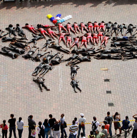 2011年6月30日,哥倫比亞卡利,動(dòng)物保護(hù)主義者半裸身體,身上涂滿油漆,在廣場上擺出一頭公牛的圖案,以此抗議斗牛運(yùn)動(dòng)。動(dòng)物保護(hù)主義者打出的標(biāo)語為:“夠了!”