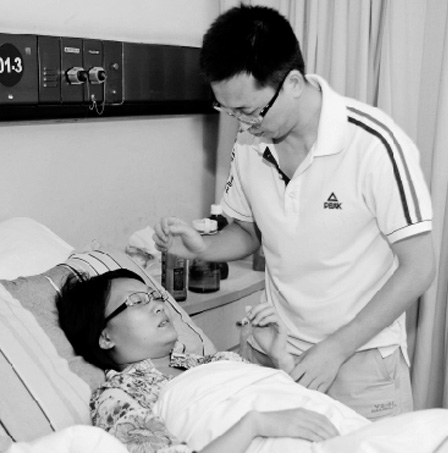 昨天下午,王翠住進(jìn)了邵逸夫醫(yī)院。蓋著被子的她,靜靜地躺在病床上,面帶微笑地望著站在一旁的男友朱廣龍。“又亂了!敝鞆V龍用手溫柔地梳理著王翠的短發(fā)。