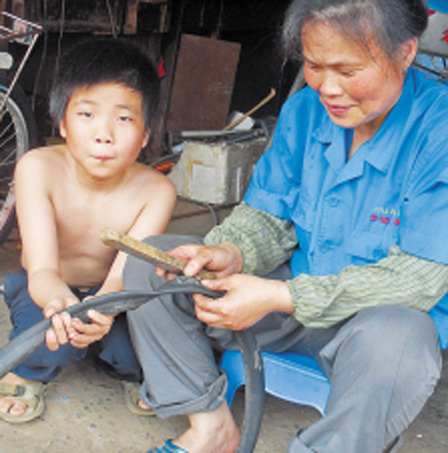 湖南孩子羅眾林雖然只有12歲,卻特別懂事。記者是在他媽媽開的修車鋪里見到他的,他正忙著給媽媽打下手呢。