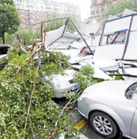 昨天下午,一陣狂風,刮落位于江東百丈東路的莫泰168連鎖酒店樓頂?shù)暮喴追,砸在了停在河對岸的汽車上?/p>