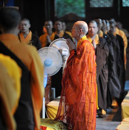 7月8日,88歲的繼云法師帶領靈隱寺僧人為妞妞誦經(jīng)祈福。當日,杭州靈隱寺近百位僧人在靈隱寺大雄寶殿舉辦祈福法事,為不久前墜樓受傷的杭州女孩妞妞祈福。據(jù)了解,墜樓女孩妞妞病情進一步好轉(zhuǎn),繼7日拔掉呼吸器后,8日妞妞自主呼吸順暢,目前呼吸、血壓、脈搏等生命體征基本平穩(wěn),關鍵的腦部神經(jīng)系統(tǒng)也有好轉(zhuǎn)跡象。新華社記者鞠煥宗攝