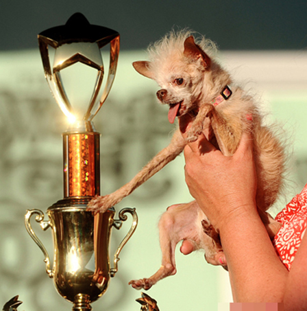 第23屆“世界最丑狗”比賽在美國加利福尼亞州佩塔盧馬舉辦。新一屆“最丑狗”冠軍被一只叫Yoda的小狗獲得。 Yoda是一只混有吉娃娃和中國冠毛犬血統(tǒng)的小狗。
