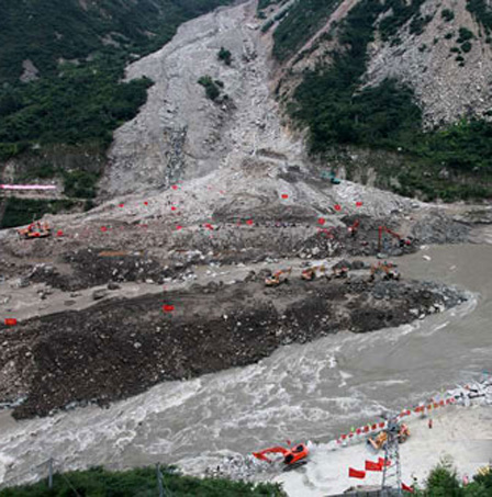 “為了將岷江河水引入泄洪槽,我們北線施工隊,正全力以赴,在攏口上方50米的地方構(gòu)筑一個釘子壩,使岷江沿著水流順利進入泄洪槽。”四川路橋北線施工負(fù)責(zé)人楊大偉介紹說。在加快推進泄洪槽挖掘的同時,左岸的工作也在加快進行。南線6日被洪水沖成“懸橋”的羅圈灣大橋的加固工作已于8日下午完成,北線汶川方向的橋頭四面體已拋到近100米遠(yuǎn)的距離。羅圈灣整個全線搶通工作正按照方案有條不紊的進行。
