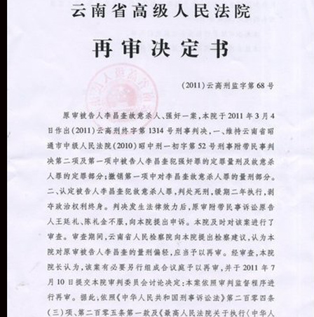 發(fā)生在云南省巧家縣的李昌奎奸殺少女、殺死3歲幼童被判死緩案又有新進(jìn)展。昨天中午12時(shí)許,云南省高級(jí)人民法院一位叫做趙林的工作人員來到巧家縣,親自將一份《云南省高級(jí)人民法院再審決定書》(以下簡(jiǎn)稱《再審決定書》)交到被害人家屬手中。《再審決定書》稱,云南省人民檢察院向云南省高院提出檢察建議,認(rèn)為高院對(duì)原審被告人李昌奎的量刑偏輕,應(yīng)當(dāng)予以再審。受害者家屬則表示,再審給了“判李昌奎死刑”一線希望,但如果再審依舊是以死緩這樣的刑事判決告終,他們將傾家蕩產(chǎn),抗訴到底。
