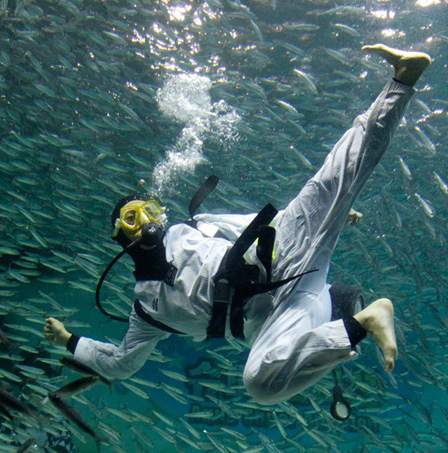 2011年7月22日,在韓國首爾的Coex水族館,潛水員們?yōu)槭钇诘挠慰蛡兎瞰I(xiàn)了一場美輪美奐的水中跆拳道表演。