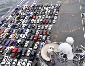 美國里根號航母幫艦載水兵搬運汽車