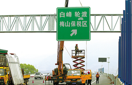 4月24日,施工人員正在穿山疏港高速公路安裝行車標(biāo)志。這條高速公路全長34公里,總投資72億元。目前,施工單位正在進(jìn)行最后的配套工程施工,以確保在6月底前建成通車。屆時,將徹底打通北侖、穿山、大榭、梅山等港區(qū)的疏港通道。