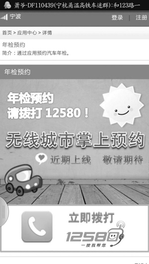 記者先在手機(jī)上輸入,頁(yè)面跳出“智慧浙江”,然后點(diǎn)擊“寧波”進(jìn)入,接著點(diǎn)擊“出行通”瀏覽(也可以下載),“出行通”頁(yè)面上,選擇“年檢預(yù)約”,點(diǎn)擊后,系統(tǒng)直接連接上12580年檢預(yù)約服務(wù)?旖,方便,是記者體驗(yàn)后的最大感觸。