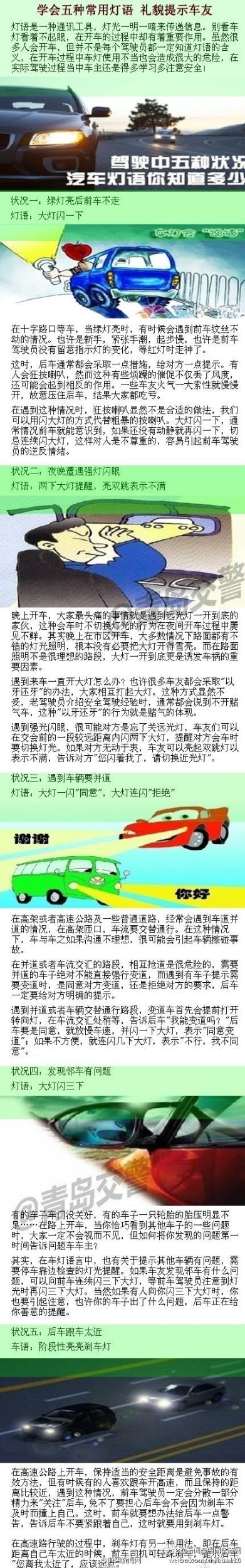 開車不會燈語,相當于人不會說話。綠燈亮了,前車不走,別狂按喇叭,可用大燈閃一下;鄰車大燈閃了三下,可能是自己的車出了問題;后車跟太近,可階段性亮亮剎車燈……“青島交警”總結出5種最常用燈語,轉(zhuǎn)走學習!學用燈語是禮貌文明的體現(xiàn)哦~~~