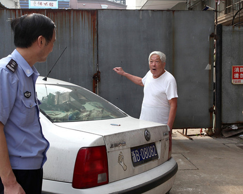 昨天下午,海曙區(qū)白云街道聯(lián)南社區(qū)居民正在告訴交警這輛擋了褲區(qū)消防通道2年之久的僵尸車。