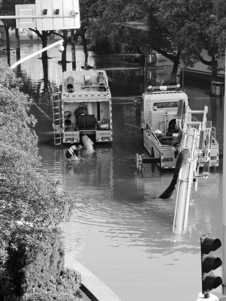 昨天,在柳汀公鐵立交橋下,市城管排水公司的兩輛大型排水車(chē)、十幾臺(tái)大型抽水泵在不間斷抽水。記者龔國(guó)榮攝