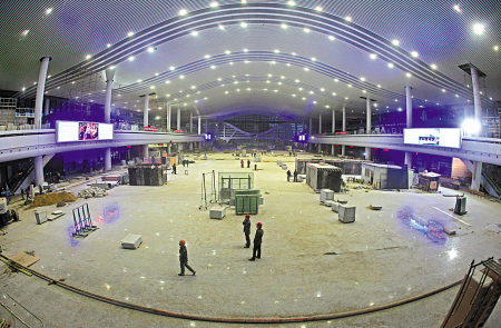 昨天晚上,中鐵建設(shè)集團(tuán)的工人正在鐵路新南站售票大廳調(diào)試燈光。這幾天,千余名施工人員正抓緊對候車大廳、自動扶梯、機房等區(qū)域已安裝的設(shè)備進(jìn)行調(diào)試,確保該工程在年底前建成。(