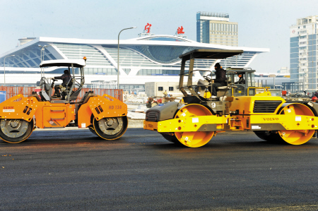 昨天,在新火車(chē)南站南廣場(chǎng)前,工人們正忙著為站前馬路鋪瀝青。記者龔國(guó)榮攝