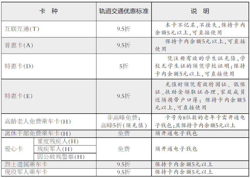 甬城通公共交通卡原主要是在公交車使用,不同卡的資費有所不同,根據(jù)市政府物價部門確定的軌道交通資費相關規(guī)定,甬城通卡各卡種在軌道交通上使用與公交車上使用也有所不同。如原來的“高齡老人免費乘車卡”在公交車使用時全免費的,但在軌道交通使用時有工作日高峰期對折票價,其他時段免費的資費規(guī)定,由于資費免費技術實現(xiàn)不同,卡號為8位數(shù)的“高齡老人免費乘車卡”均需要到寧波市民卡服務點開通電子錢包并須在卡內保持5元以上余額。離休干部免費乘車卡和愛心卡也須去服務網點開通電子錢包,但無需充值,否則將無法在軌道交通刷卡應用。為了市民更順利地在軌道交通中使用甬城通卡,市民卡公司將基本應用常識歸納并告知廣大市民(詳見右表)。
