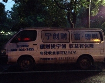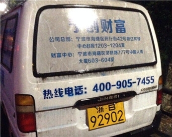 高塘路(高塘菜場)門口也有一輛車身外側(cè)標(biāo)注理財廣告的面包車,己經(jīng)?堪肽甓嗔,一直沒移動過。車牌:浙B92906