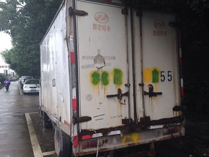 瑞園小區(qū)東門薛家南路非機動車道的停車位上有一輛白色爆廢卡車,無牌照