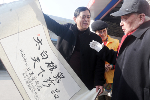 寧波抗戰(zhàn)老兵代表,寧波黃埔軍校同學會樊寶法老先生,代表寧波抗戰(zhàn)老兵接受“太白水”公司的5萬元新年紅包,并為“太白水”題詞“太白礦泉,天下珍品!
