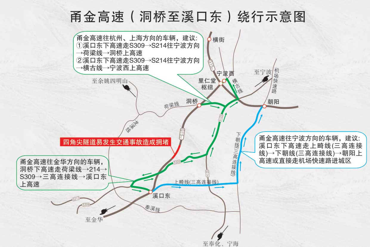 如果甬金高速(洞橋至溪口東)的四角尖隧道發(fā)生意外造成擁堵,從甬金高速往杭州、上海方向的車(chē)輛,建議溪口東下高速走S309→S214往寧波方向→荷梁線→洞橋上高速或溪口東下高速走S309→S214往寧波方向→橫古線→寧波西上高速。