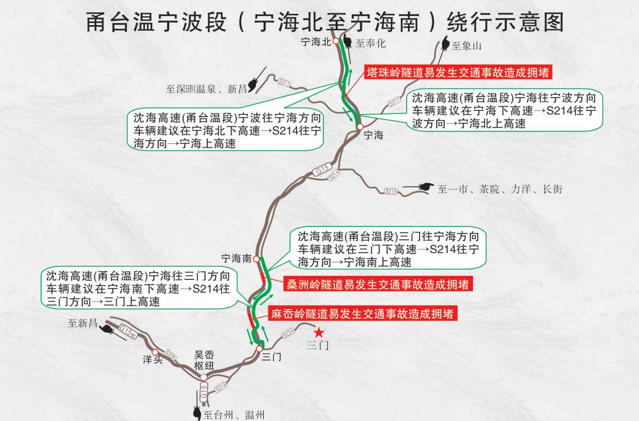 寧海往寧波東方向車輛建議在奉化下高速→奉錢線→寧西線→姜山上高速;寧海往杭州、上海方向車輛建議奉化下高速→大成路→三高連接線→朝陽上高速;上海、杭州方向來車建議從朝陽下高速走三高連接線往奉化方向→大成路→奉化上高速。