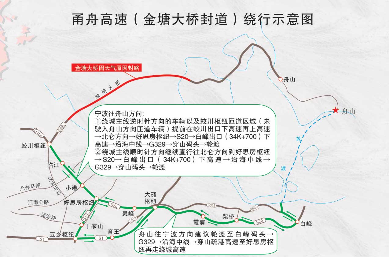 春節(jié)期間,金塘大橋可能因惡劣天氣等原因?qū)嵭蟹獾。如遇大橋封道,寧波往舟山方向可提前在蛟川出口下高速再上高?rarr;北侖方向→好思房樞紐→S20→白峰出口(34K+700)下高速→沿海中線→G329→穿山碼頭→輪渡或繼續(xù)直行往北侖方向到好思房樞紐→S20→白峰出口(34K+700)下高速→沿海中線→G329→穿山碼頭→輪渡;舟山往寧波方向建議輪渡至白峰碼頭→G329→沿海中線→穿山疏港高速至好思房樞紐再走繞城高速。