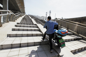 昨天,市民艱難地推著電動(dòng)自行車上鄞州南翔橋輔橋。由于坡度太大,把車子推上去得出一身汗。