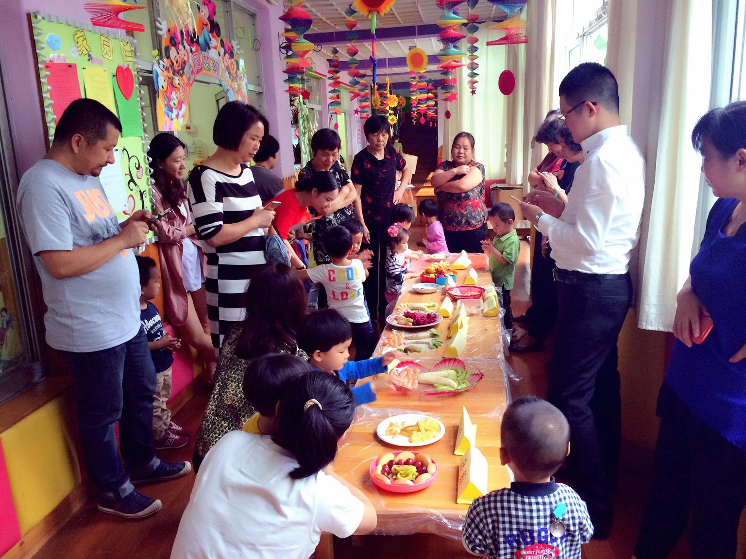 活動(dòng)前,家長(zhǎng)和孩子們準(zhǔn)備好材料所需的工具:水果刀、牙簽、果盤等。活動(dòng)中,親子們配合默契,由于我們年齡段小,但我們寶貝們也做一些力所能及的事,隨處可見孩子們幫忙遞東西,嘗試擺盤等。整個(gè)活動(dòng)現(xiàn)在儼如一個(gè)水果加工廠。不一會(huì)兒,一款款造型獨(dú)特、形象美觀的水果拼盤呈現(xiàn)在我們的眼前。接下來是評(píng)獎(jiǎng)和品嘗活動(dòng)。由家長(zhǎng)和孩子現(xiàn)場(chǎng)觀投票,最終得出了“最佳創(chuàng)意獎(jiǎng)”、“最佳造型獎(jiǎng)”和“最美意境獎(jiǎng)”。
