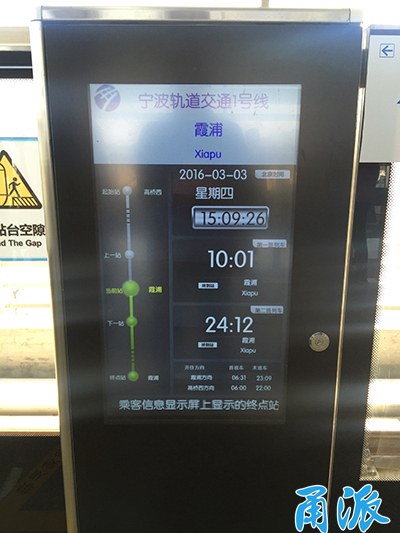 具體時(shí)間方面:15:12霞浦站開出,15:13到長江路站,15:15到中河路站;15:18到松花江路站;15:21到大碶站;15:24到邱隘站;15:31到寶幢站;15:36到五鄉(xiāng)站;15:40到邱隘站;15:42到東環(huán)南路站。這個(gè)時(shí)間僅供參考,不排除正式運(yùn)營后會調(diào)整哦。