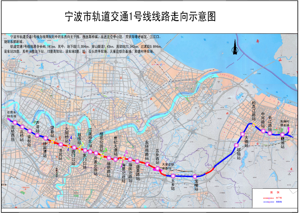 1號線二期工程全長約25.28公里,有車站9座,其中地下站1座,高架站8座,由西至東分別為邱隘站、五鄉(xiāng)站、寶幢站、鄔隘站、大碶站、松花江路站、中河路站、長江路站、霞浦站。