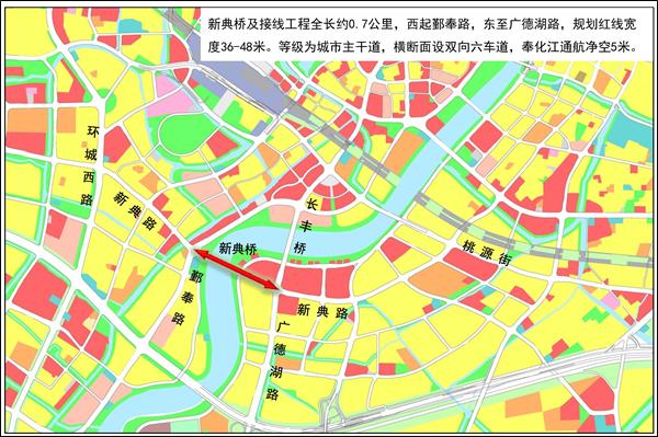 規(guī)劃顯示,新典橋位于鄞州區(qū)、海曙區(qū),西起鄞奉路,東至廣德湖路。工程道路等級(jí)為城市主干路,全長(zhǎng)約700米,道路標(biāo)準(zhǔn)寬度36-48米。規(guī)劃雙向6車道,奉化江通航凈空5米。規(guī)劃的新典橋和一旁的長(zhǎng)豐橋一道,將大大方便鄞州區(qū)和海曙區(qū)的互通往來(lái)。