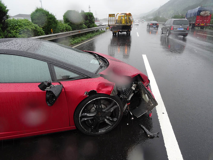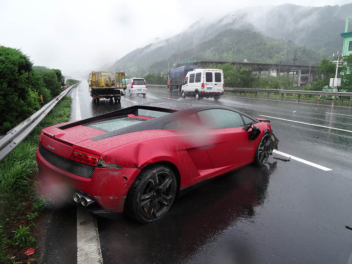 6月13日中午11點30分左右,周師傅駕駛價值400多萬元的紅色蘭博基尼超級跑車由杭州上高速去寧波,途經280k處時,由于雨量較大,加上車速過快,蘭博基尼輪胎打滑,徑直撞上了集卡車的左前輪,在高速上轉了好幾個圈之后才停下,損毀嚴重。
