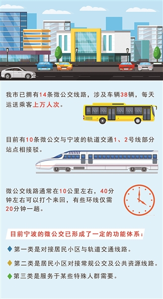隨著寧波經(jīng)濟(jì)的快速發(fā)展,城市框架已經(jīng)拉開,城區(qū)面積不斷延伸,市民對(duì)城市公共交通的需求也不斷增多。尤其是軌道交通建設(shè)的加快,從家里到地鐵站的最后一公里問題開始凸現(xiàn)!拔⒐弧钡某霈F(xiàn),是對(duì)現(xiàn)有公交線網(wǎng)體系的有益補(bǔ)充,它增加了城區(qū)公交覆蓋面,提升了城區(qū)居民出行便捷度。