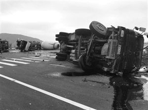 發(fā)生事故后,運土車與水泥槽罐車同時側(cè)翻在地,汽車零件散落一地,現(xiàn)場一片狼藉。