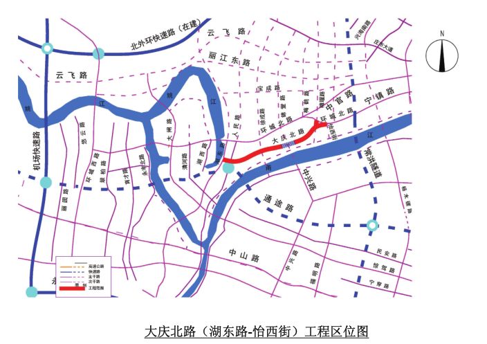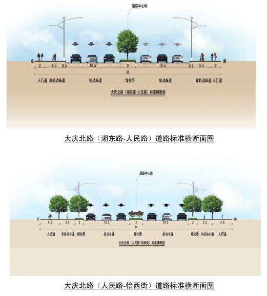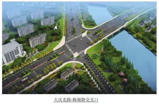 工程主要設(shè)計內(nèi)容包括道路、橋梁、雨污排水管、給水管、道路配套綠化、交通設(shè)施以及路燈等。根據(jù)規(guī)劃,大慶北路(湖東路-怡西街)道路為城市主干路,主線設(shè)計行車速度50km/h,其中人民路以西標(biāo)準(zhǔn)斷面寬36米,人民路以東標(biāo)準(zhǔn)斷面寬44米。梅堰路道路等級為城市主干道,標(biāo)準(zhǔn)斷面寬44米。整個大慶北路(湖東路-怡西街)道路工程工期約為500天,總投資約12.84億元。