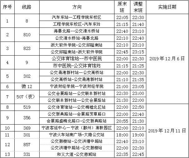 今天起,市公交302路等7條線路實(shí)施延時(shí)收班,開啟寧波公交夜間服務(wù)再升級(jí)工程。此外,12月11日,市公交還將對(duì)519路等6條線路實(shí)施延時(shí)。