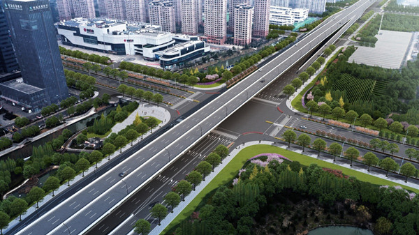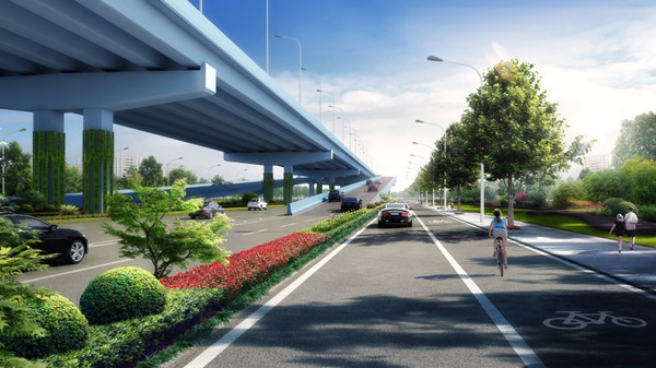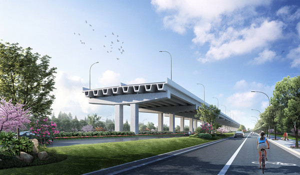 該工程采用“主線(xiàn)高架+地面輔道”的建設(shè)形式,其中主線(xiàn)高架為雙向6車(chē)道,地面輔道為雙向6車(chē)道+兩側(cè)機(jī)非混行道;高架設(shè)計(jì)速度80公里/小時(shí),地面主車(chē)道設(shè)計(jì)速度50公里/小時(shí);同步實(shí)施雨水、電力、燃?xì)狻⒔o水和綜合通信等管線(xiàn)工程,以及景觀(guān)綠化工程。
