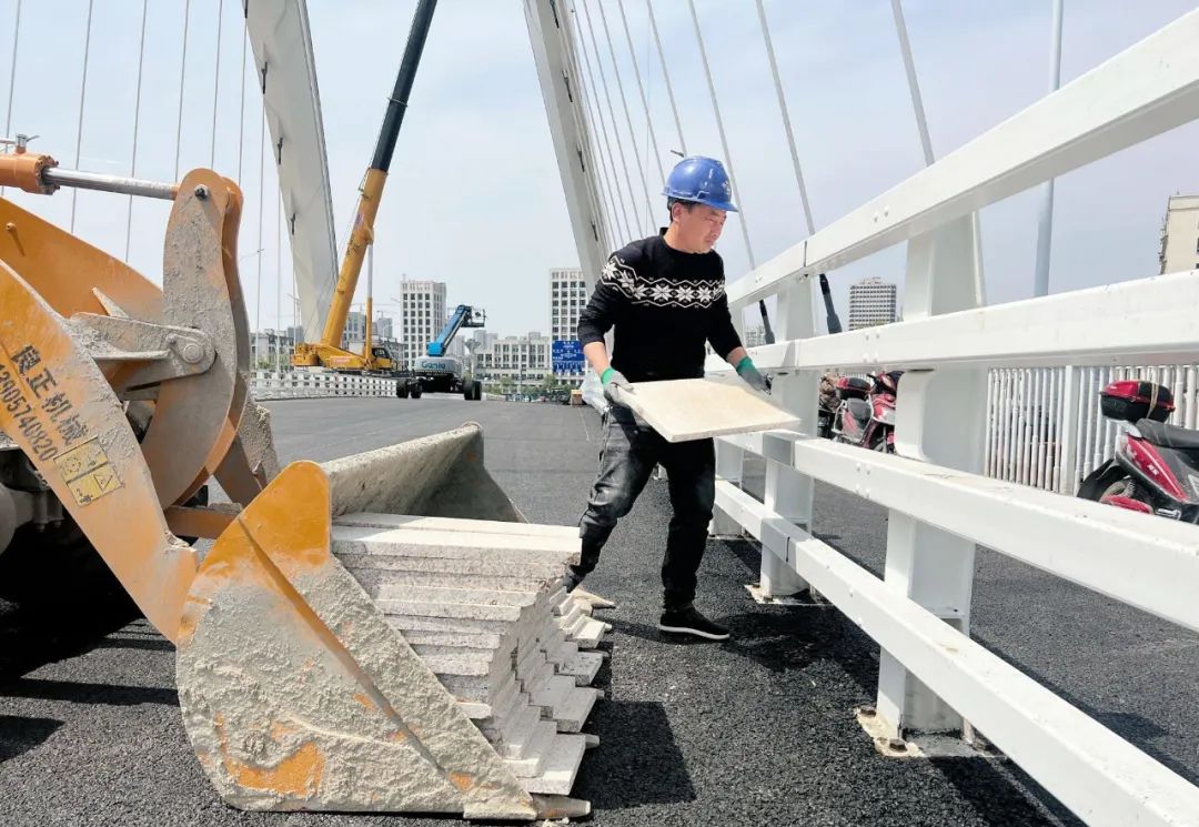 大橋兩側(cè)的人行道正在鋪裝;護欄在打磨后,進行著最后的焊接;兩臺曲臂高空作業(yè)車護送工人抵達(dá)大橋上空,進行燈光調(diào)試……4月3日上午,橫跨奉化江面的新典橋項目正在進行收尾工作,有望于4月底通車。