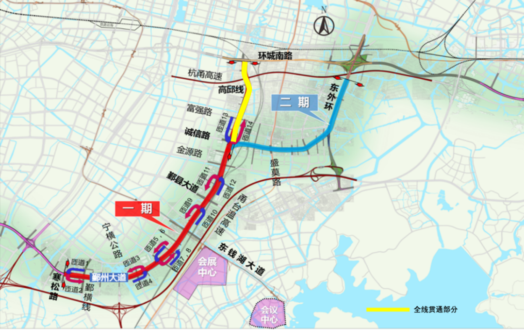 鄞州大道-福慶路(東錢湖段)快速路一期工程西起寒松路,沿鄞州大道、福慶路至環(huán)城南路,全長(zhǎng)8.39公里。