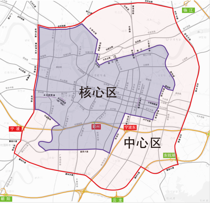 核心區(qū)指逆時針由甬江-慶豐橋-人民路-環(huán)城北路-倪家堰路-寧慈東路-北環(huán)西路-機場北路-機場路-環(huán)城南路-奉化江-鄞縣大道-滄海路-興寧路-興寧東路-福慶南路-福慶北路-通途路-聚賢路為邊界圍成的封閉區(qū)域內(nèi)道路(不含區(qū)域內(nèi)的高速公路)。