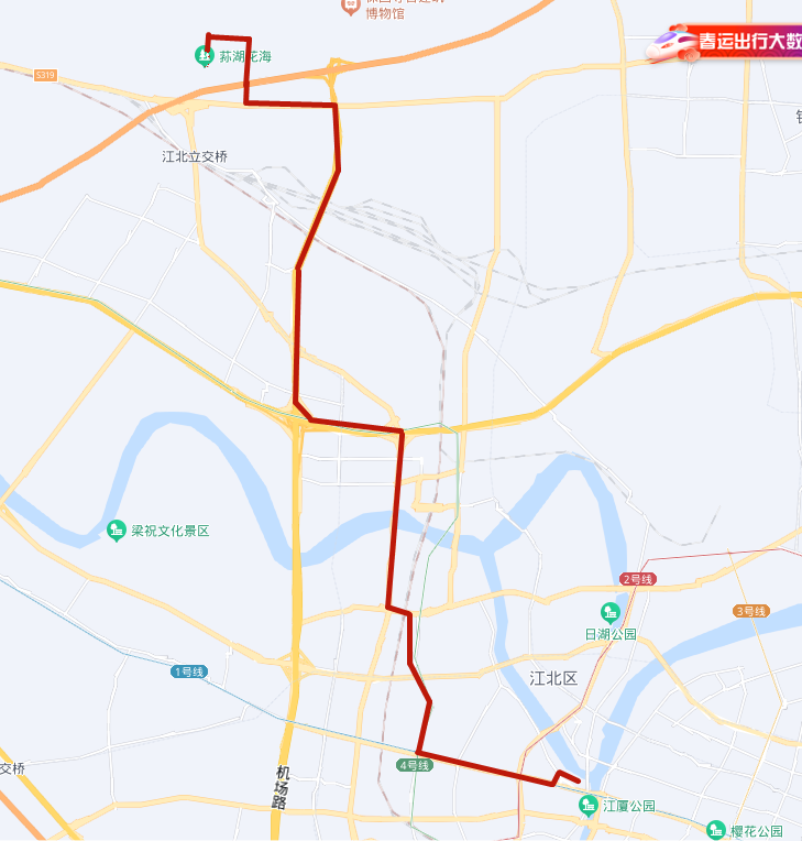 線路走向:和義路、開明街↓、中山東路↑、江廈街↑、藥行街↑、開明街↑、中山東路、中山西路、翠柏路、環(huán)城北路、青林渡路、江北大橋、江北大道、機(jī)場(chǎng)路高架、榮吉西路、鞍前線↓、彩云路↓、蓀湖路。